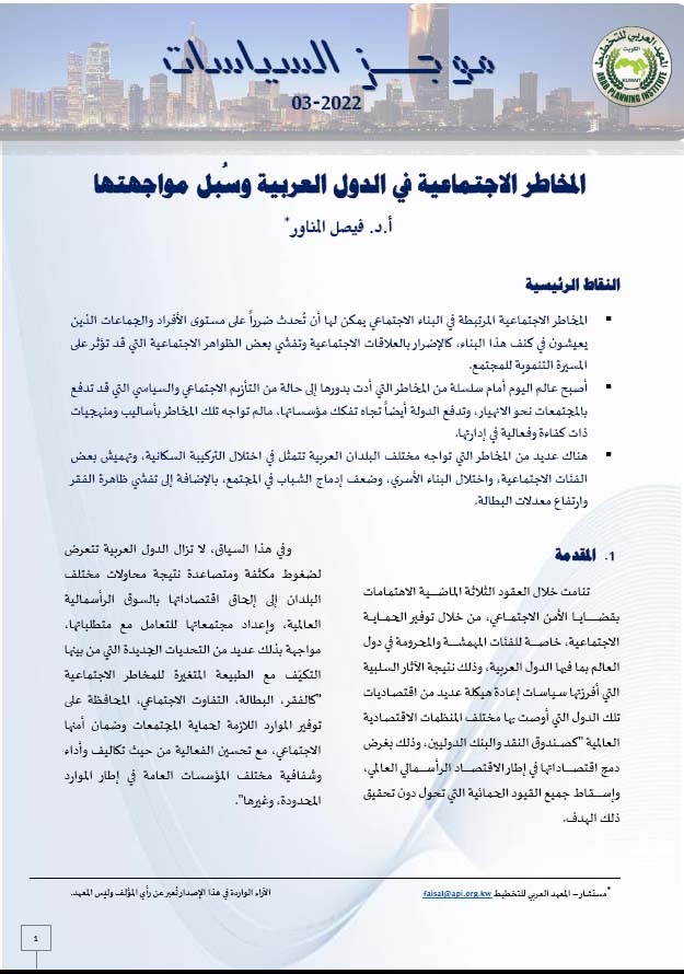 موجز السياسات - العدد الثالث بعنوان-"المخاطر الاجتماعية في الدول العربية وسبل مواجهتها"